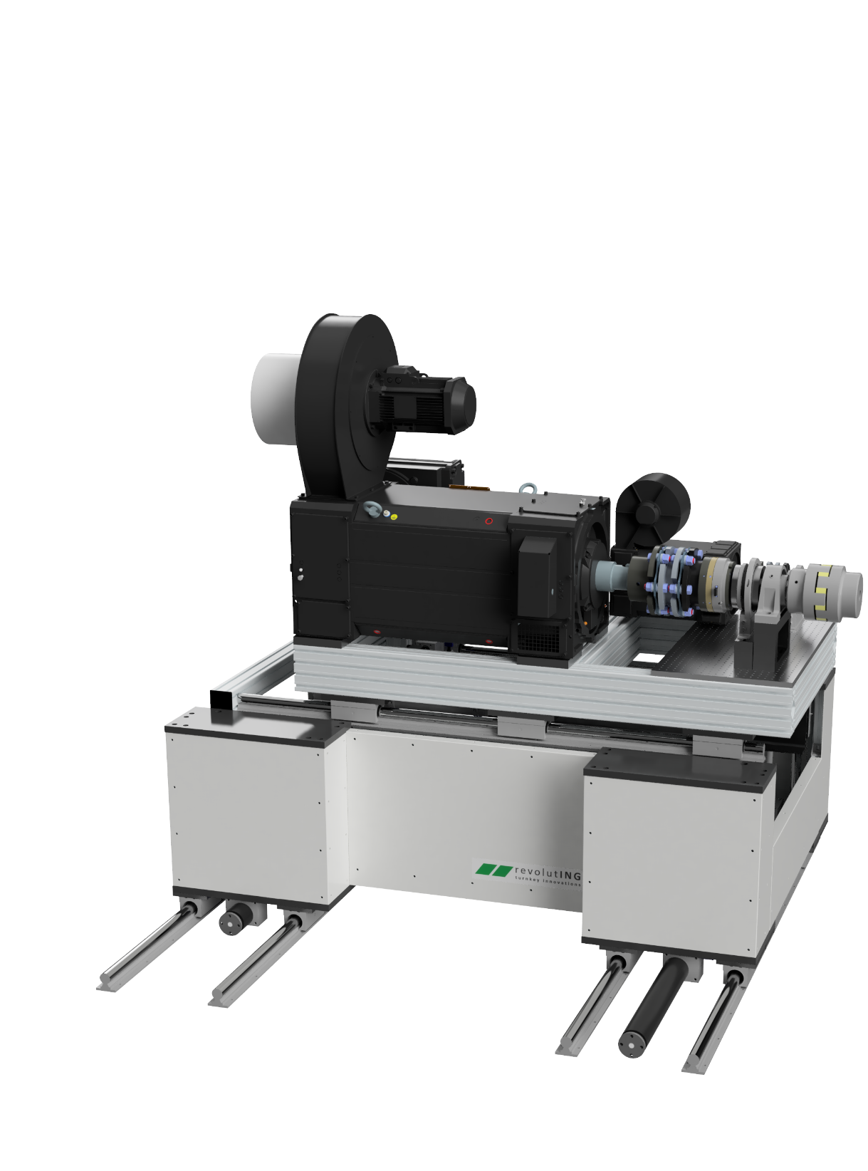 Die Anlage positioniert SPS-gesteuert mittels Schrittmotoren und Hochgenauigkeits-Spindelantrieben zwei aufgebaute Elektromotoren mit 400kW und 160 kW Leistung inkl. Messtechnik auf wenige hunderstel Millimeter genau zu den zu prüfenden Pumpen.